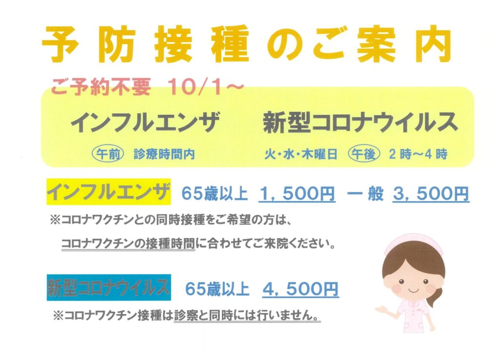 インフルエンザ・新型コロナウイルス予防接種投稿日: 2025年9月25日作成者 栗林病院 令和7年10月1日からインフルエンザ・新型コロナウイルスの予防接種が始まります。 65歳以上の公費接種期間は、 インフルエンザ:令和7年10月1日~令和8年1月31日 新型コロナウイルス:令和7年10月1日~令和8年3月31日 インフルエンザ・新型コロナウイルスの接種券や予診票の個別送付はありませんので マイナンバーカード、資格確認書、運転免許証など氏名・生年月日・住所が確認できるものをご持参の上ご来院ください。 詳細は案内をご覧ください。